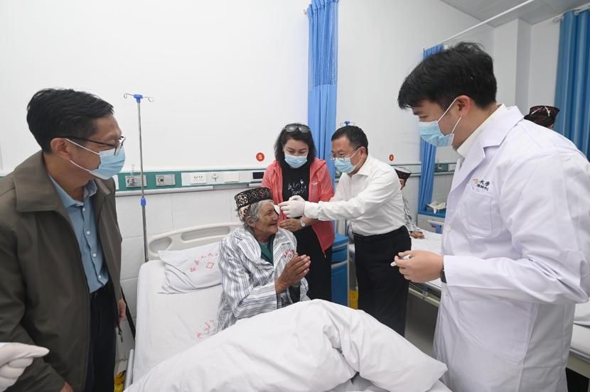 8月10日,陈春声书记在塔县人民医院为白内障患者加提克·居马揭开手术眼包