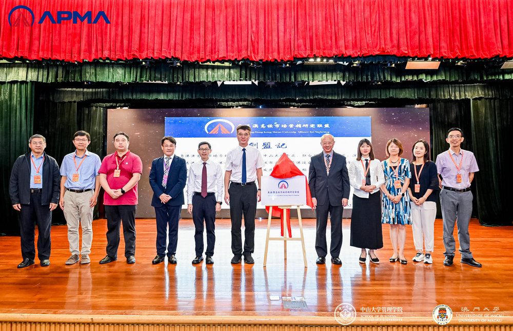 联盟理事长王海忠与创盟院校及亚太地区其他院校代表共同展示了亚太营销会议的会旗。旗帜上的会徽传达了守正、进取、创新、开放的价值观,希望APMA会议能够立足于粤港澳,深根于中国大地,联结国际学术界;以远航巨轮的进取,乘风破浪,勇于探索;以山之高峰的韧性,持续创新,臻于至善;以天空和海洋的广袤,开放包容,畅想无限;始终与世界同频,积极向上,永无止境。