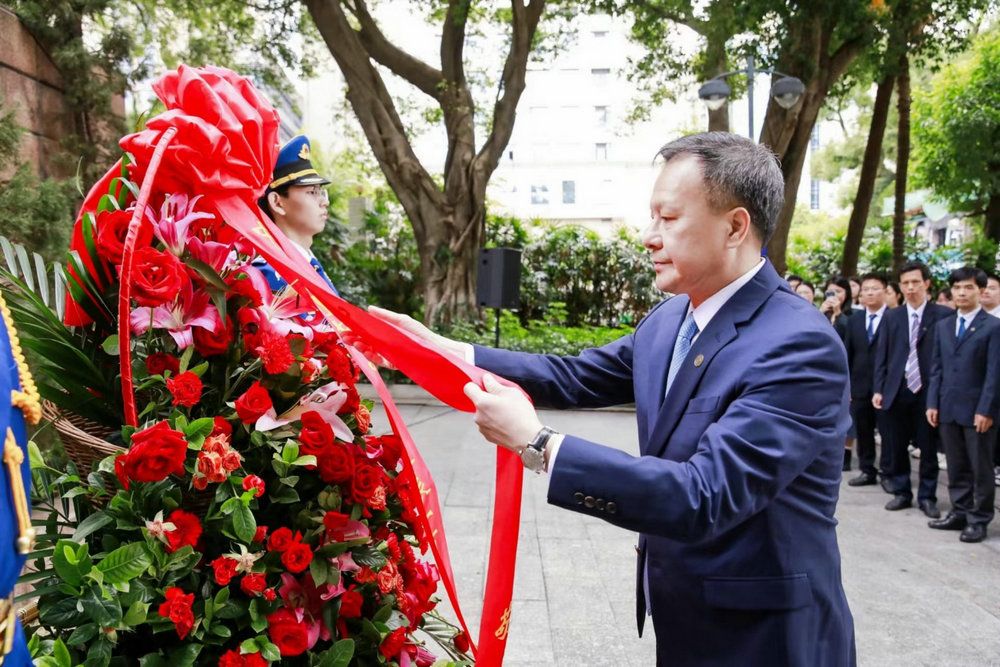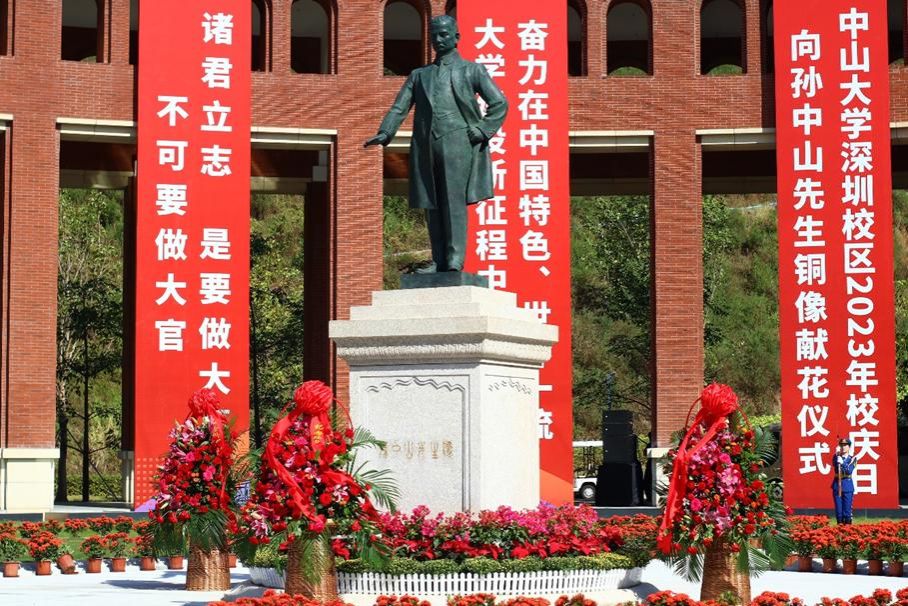 这是bat365在线中国登录入口首次在三校区五校园同步举行校庆日献花仪式。献花仪式前,学校在深圳校区举行了隆重的孙中山先生铜像落成仪式。