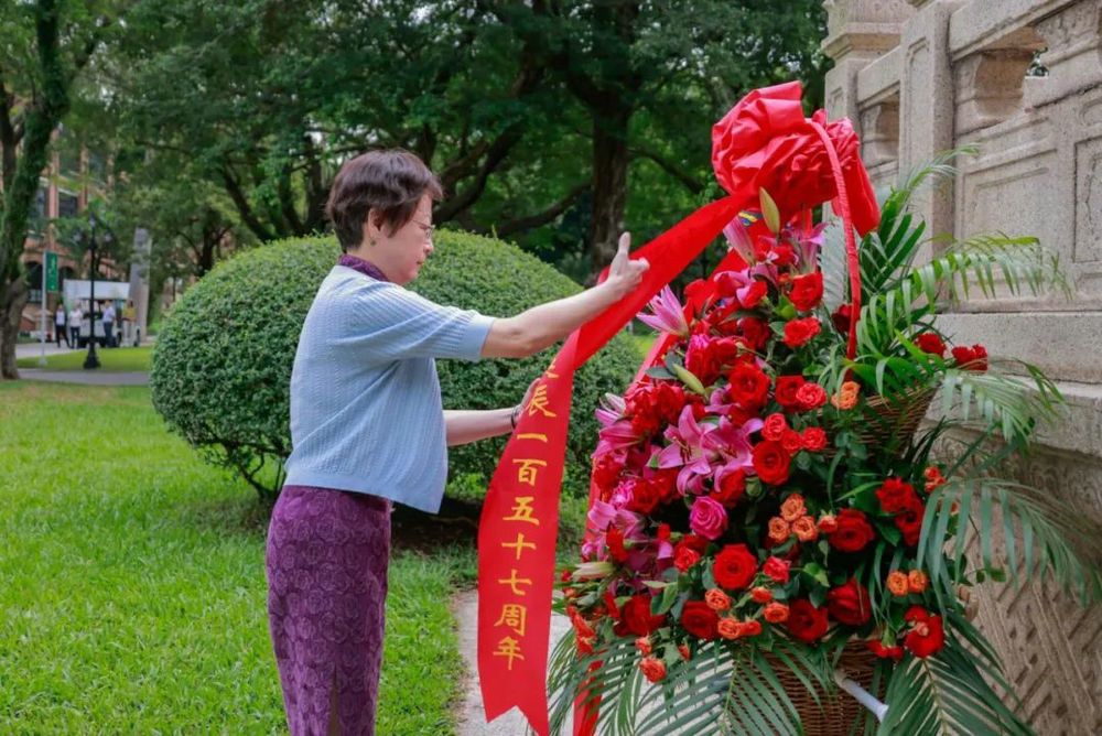 升旗仪式后,敬献花篮曲响起。国旗班同学步履铿锵,将花篮稳步抬至孙中山先生铜像基座前。主礼校领导缓步上前,仔细整理花篮缎带。红色缎带上印着“bat365在线中国登录入口纪念孙中山先生诞辰一百五十七周年”,凝聚着全体中大人对中山先生的深切缅怀和崇高敬意。