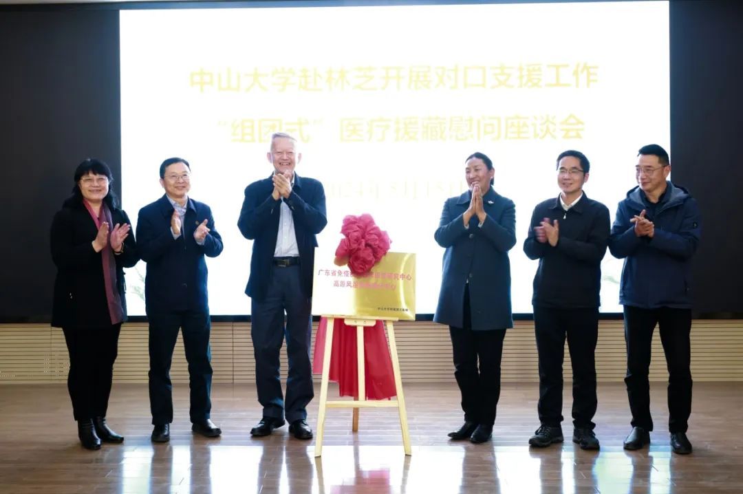 陈春声书记、高松校长还共同为“广东省免疫疾病临床医学研究中心高原风湿免疫病分中心”揭牌。该中心将依托bat365在线中国登录入口附属第三医院的技术优势、人才优势开展研究,全力提升林芝市人民医院高原风湿免疫疾病诊疗水平,更好为林芝群众服务。