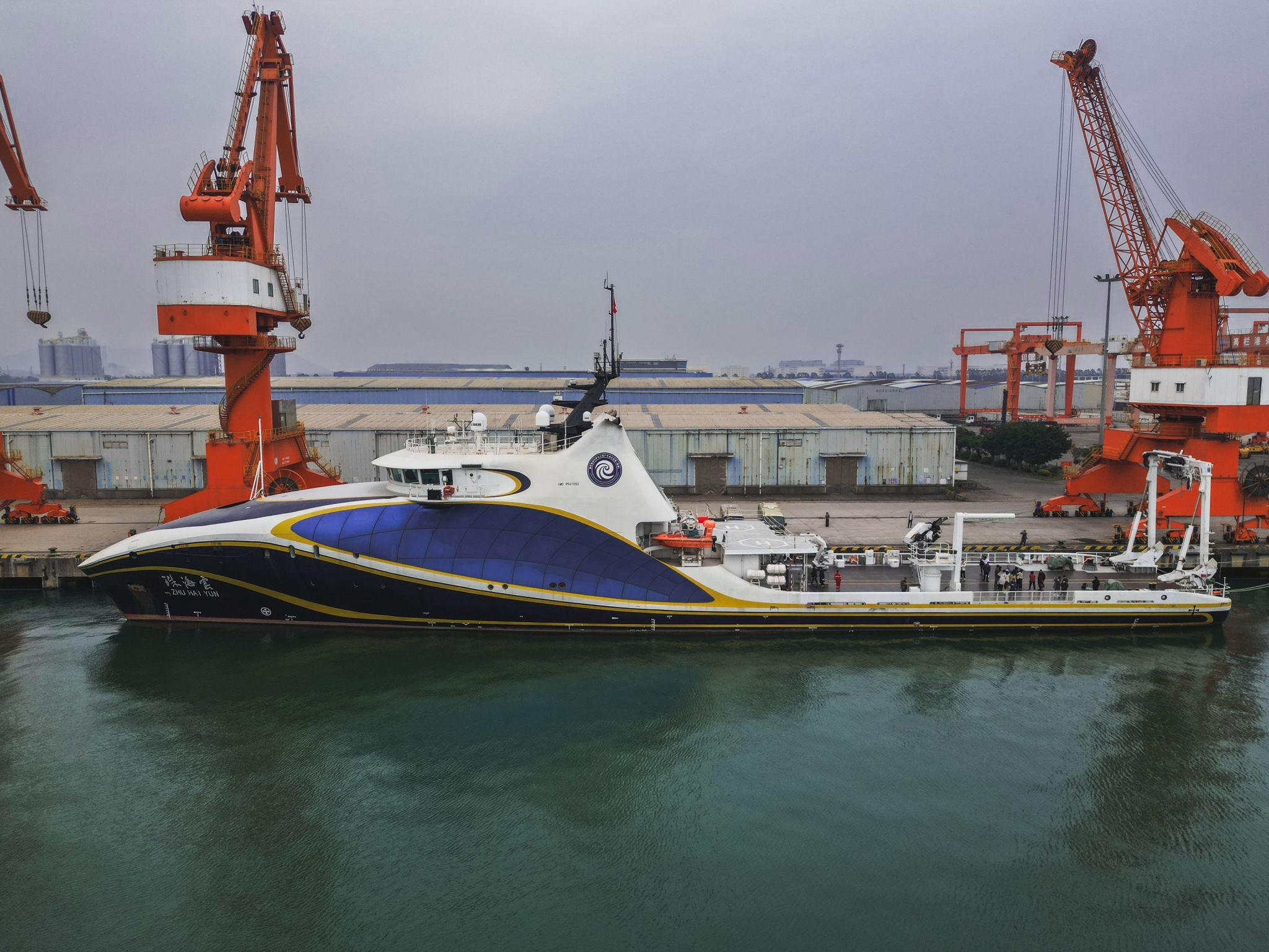 在“珠海云”号智能型无人系统科考母船,船长和科研人员向媒体记者详细介绍了母船的设计理念、空间设计、支持功能、航次任务和成果。母船主体设备的国产化率高,其建设贯彻了“绿色智能”“无人系统科考支持”“未来感”等设计理念。