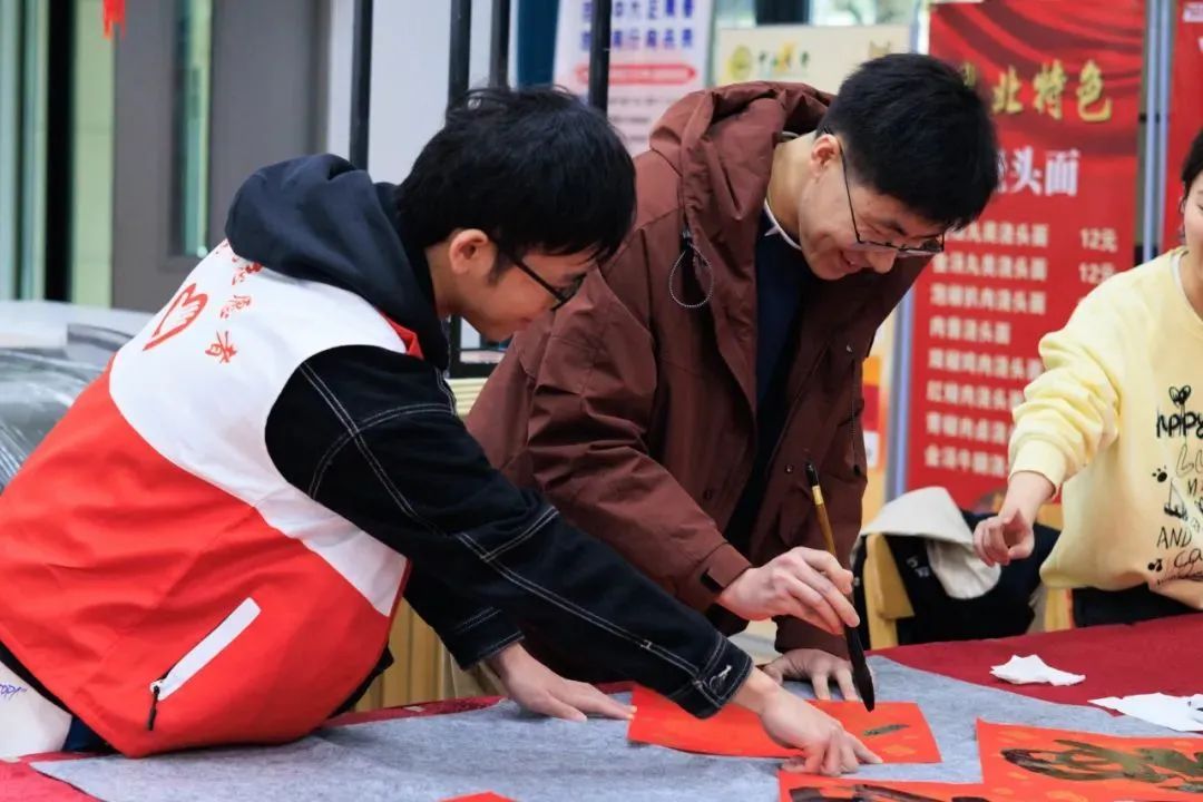现场还有手写春联,满载着最纯粹的年味,红纸金粉黑墨,一横一竖,一撇一捺间,我们许愿——欢愉胜意,万事可期。