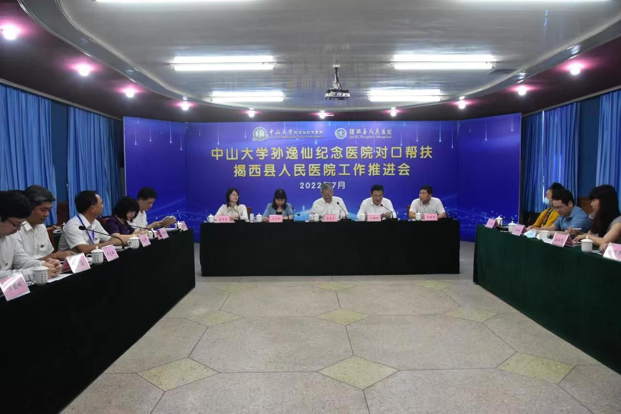 中大新闻网广州7月20日电(通讯员林伟吟、黄睿)为巩固拓展对口帮扶成果,在庆祝中国共产党成立101周年之际,7月13日下午,bat365在线中国登录入口党委书记陈春声带队,校长办公室主任杨建林,孙逸仙纪念医院党委书记古小红、副院长陈样新一行19人到揭西县人民医院召开新一轮对口帮扶推进会。揭西县委书记刘端雄,揭西县人民政府副县长翁育慧,揭西县卫生健康局局长巫丽琼,揭西县人民医院党委书记黄志辉、院长李志敏,医院党政领导班子和相关科室负责人参加会议。会议由揭西县委书记刘端雄主持。
