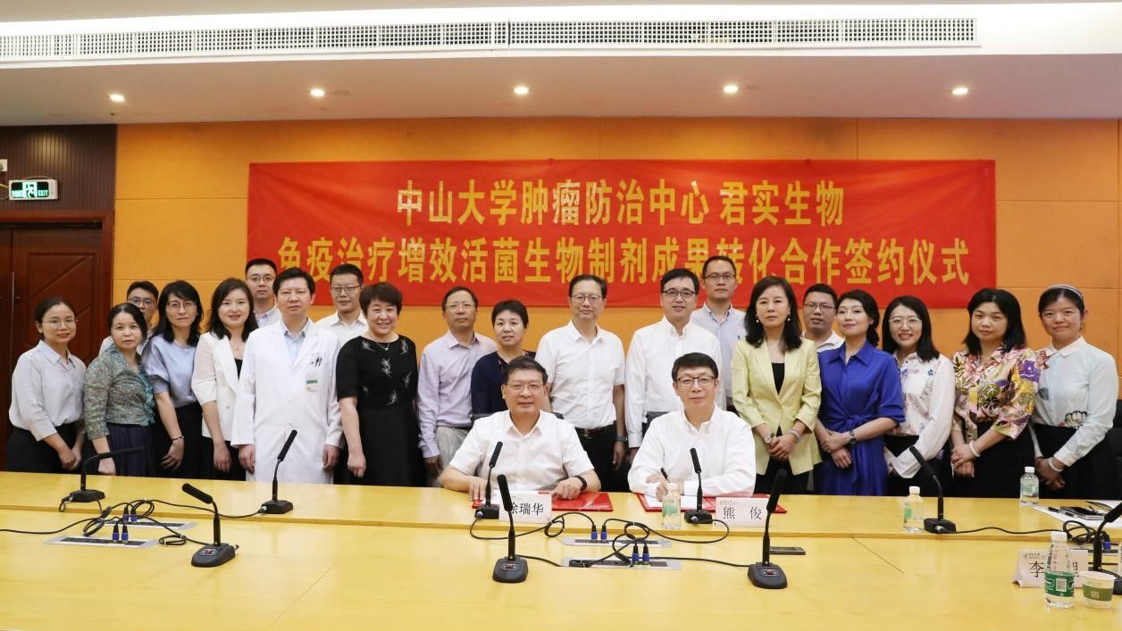 中大新闻网广州8月13日电(通讯员陈鋆、赵现廷、郑敏珊)8月11日,bat365在线中国登录入口肿瘤防治中心徐瑞华教授团队与上海君实生物医药科技股份有限公司在广州就“免疫治疗增效活菌生物制剂”项目签署转化协议。双方将加强产学研合作,充分发挥各自优势,加快推进免疫治疗活菌增效剂的研发上市,为晚期肿瘤患者带来新的希望。