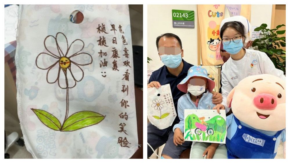 在活动里面,不善言辞的桢桢(化名)爸爸用画笔画出了笑脸小花,为正在接受治疗的孩子鼓舞打气,不一会儿,一朵小花便跃然纸上,旁边还有一句配文:“爸爸喜欢看到你的笑脸,早日康复,桢桢加油”!