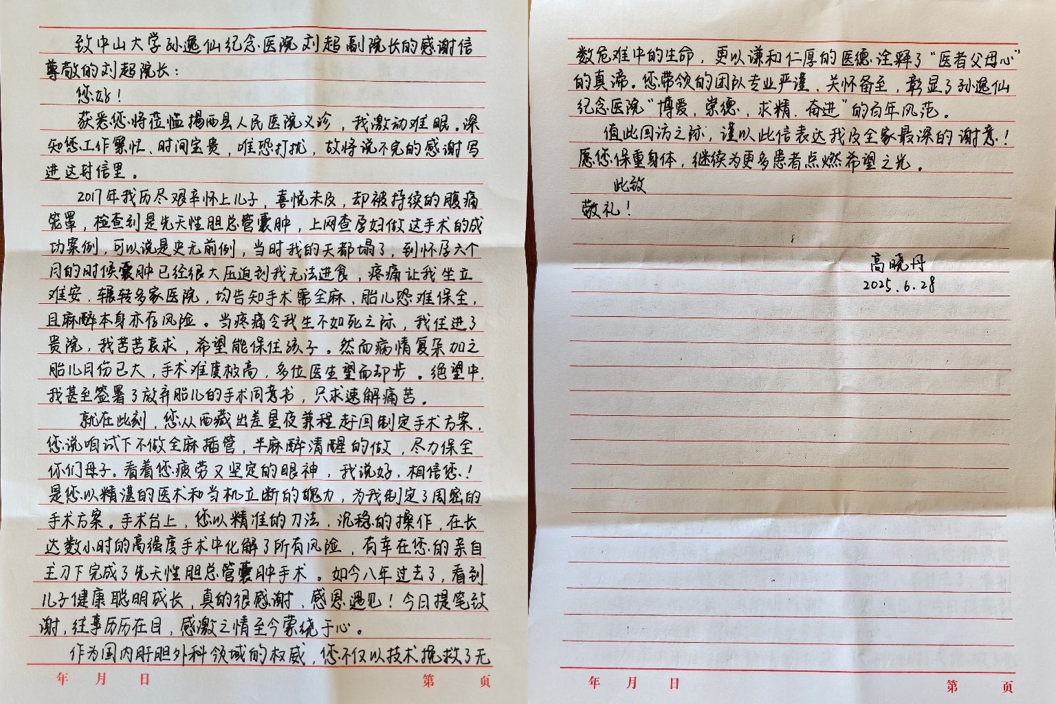 在孙逸仙纪念医院副院长刘超的门诊中,一封来自八年前患者的感谢信令人动容:患者孕中因先天性胆总管囊肿命悬一线、多院束手无策之际,刘超果断制定方案成功手术,保全母子平安。如今孩子健康成长,患者在信中盛赞他的仁心仁术。