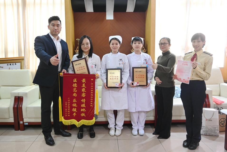 中大新闻网1月28日广州电(通讯员林伟吟)2022年1月27日下午,孙逸仙纪念医院妇产科主治医师聂晓露、护理实习生凌慧婷、霍颖从广州地铁相关领导手中接过“最美乘客”牌匾,她们于2021年11月13日在黄沙地铁站见义勇为,成功救治心脏骤停乘客。