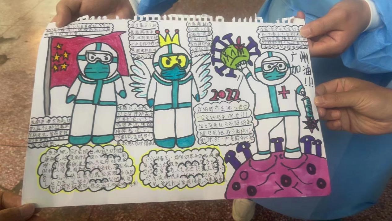 在疲惫的核酸采样工作中,暖心的事情在不断地发生。一位老奶奶带着一个八九岁小女孩走到华桂荣的面前,小女孩拿出手中的画,对着华桂荣说:“白衣天使,您辛苦了,这副画送给你们”。