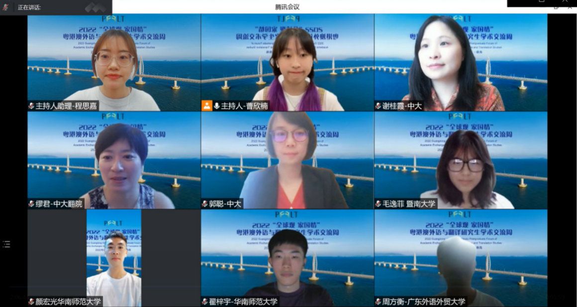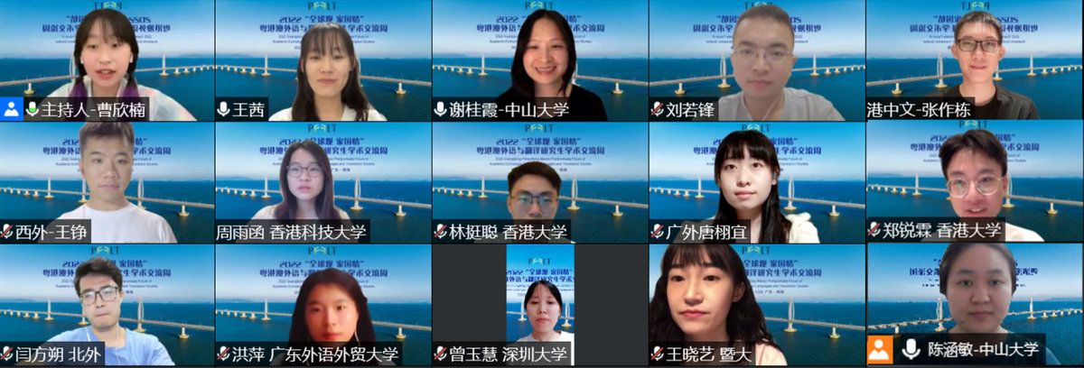 中大新闻网广州6月16日电(通讯员冯伟乐)6月10日至13日,由广东外国语言学会、广东省外国文学学会、香港翻译学会及bat365在线中国登录入口国际翻译学院联合主办,bat365在线中国登录入口国际翻译学院研究生会承办的2022“全球观 家国情”粤港澳外语与翻译研究生学术交流周成功举办。本届学术交流周活动采用现场会议与视频会议相结合的举办方式。来自粤港澳三地及全国其他地区的专家学者和百余名外语学科博士、硕士研究生在线上、线下两个平台集结于此,以外语与翻译为桥,对话学科前沿,提升学术素养,感触城市脉搏,促进文化交融,立足青年发展,共诉家国情怀。