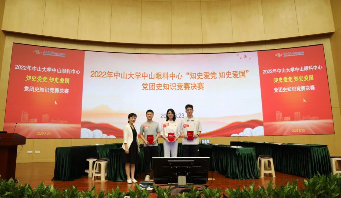 中大新闻网广州6月28日电(通讯员唐艳丽)为深入学习贯彻习近平新时代中国特色社会主义思想,引导广大党员、团员知史爱党、知史爱国,推动党史学习教育常态化长效化,为迎接党的二十大胜利召开营造浓厚氛围,在“七一”到来之际,6月23日下午,中山眼科中心党委在珠江新城院区实验楼学术报告厅举办了2022年“知史爱党 知史爱国”党团史知识竞赛决赛。本次活动的主题是“喜迎二十大,永远跟党走,奋进新征程”。中心党委委员、纪委委员等出席活动,各支部党员、发展对象、入党积极分子代表,以及团员青年代表等到场观赛学习。