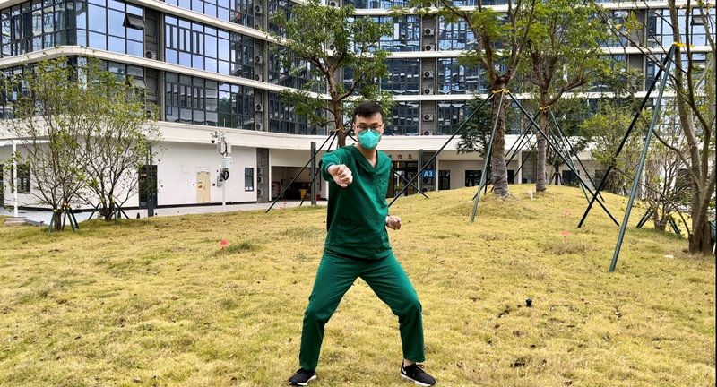 同时,针对于无症状、疾病恢复期及老年患者,杨联胜在工作空闲之余,以“安全适度”为原则,录制了相应的八段锦视频,供方舱患者调理身心。“八段锦为古代中医传统导引养生功法,简单易行,患者通过练习可调节免疫力,缓解焦虑情绪,促进呼吸功能恢复,加速康复进程。”杨联胜说。