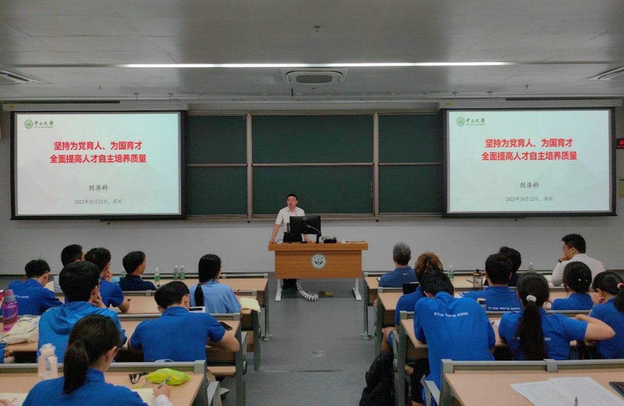 中大新闻网讯(通讯员赵晓江)近日,刘济科副校长在深圳校区西教学楼二栋403教室,以“坚持为党育人,为国育才,全面提高人才自主培养质量”为主题,为航空航天学院、网络空间安全学院、电子与通信工程学院100多名学生讲授思想政治理论课。