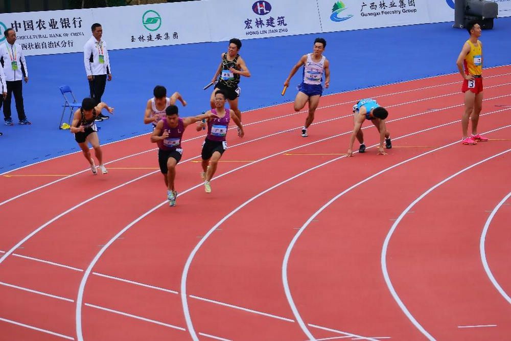李文杰和禤达军在大学男子甲组4X100米接力(铜牌)中交接棒