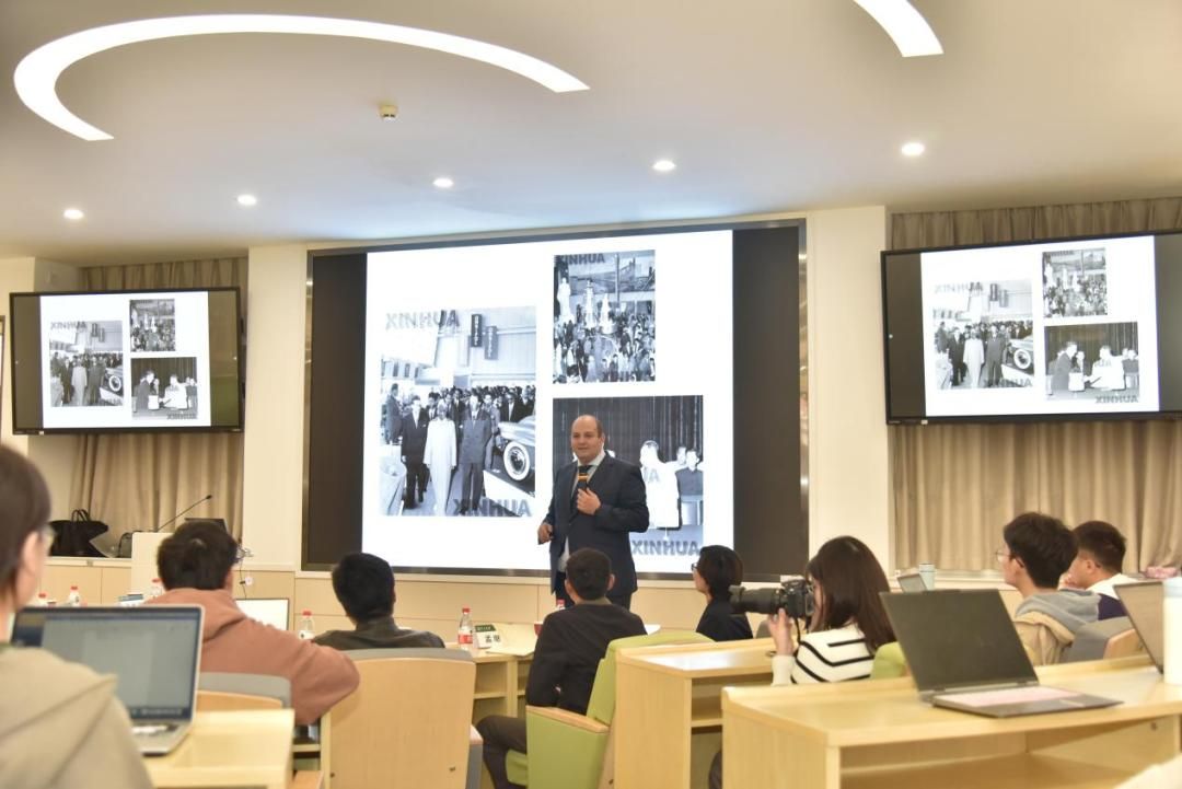 纳赛尔博士从中国90年代“引进来”与“走出去”战略讲起,梳理了中国推动共建“一带一路”的深厚背景,阐述了摩洛哥在二战后的国家建设路径,并将两国发展之路作了联系与分析,对中国一直以来的独立自主的和平外交政策、“绿水青山就是金山银山”的环保理念、分享科技成果的宽广胸怀表示赞赏。他结合在两国的生活经验,以生动的图片和视频为大家讲解文化共融的经贸合作新模式,向大家展示了摩中合作的历史渊源、“一带一路”背景下摩中合作的代表成果。讲座中,纳赛尔博士与同学们深入互动,现场气氛热烈。