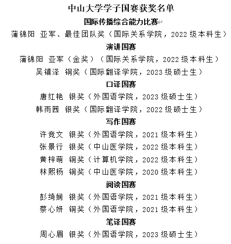 中大学子在这场历经两个多月的赛事中突破重重选拔,展现了“学在中大,追求卓越”的风采,以青春之声发强国之音、扬奋斗之志,为增进中国与世界的相互了解贡献力量。指导教师们也将会继续在外语教学领域推进第一课堂和第二课堂相融合,践行使命,积极探索培育我校新时代复合型外语人才的有效路径。