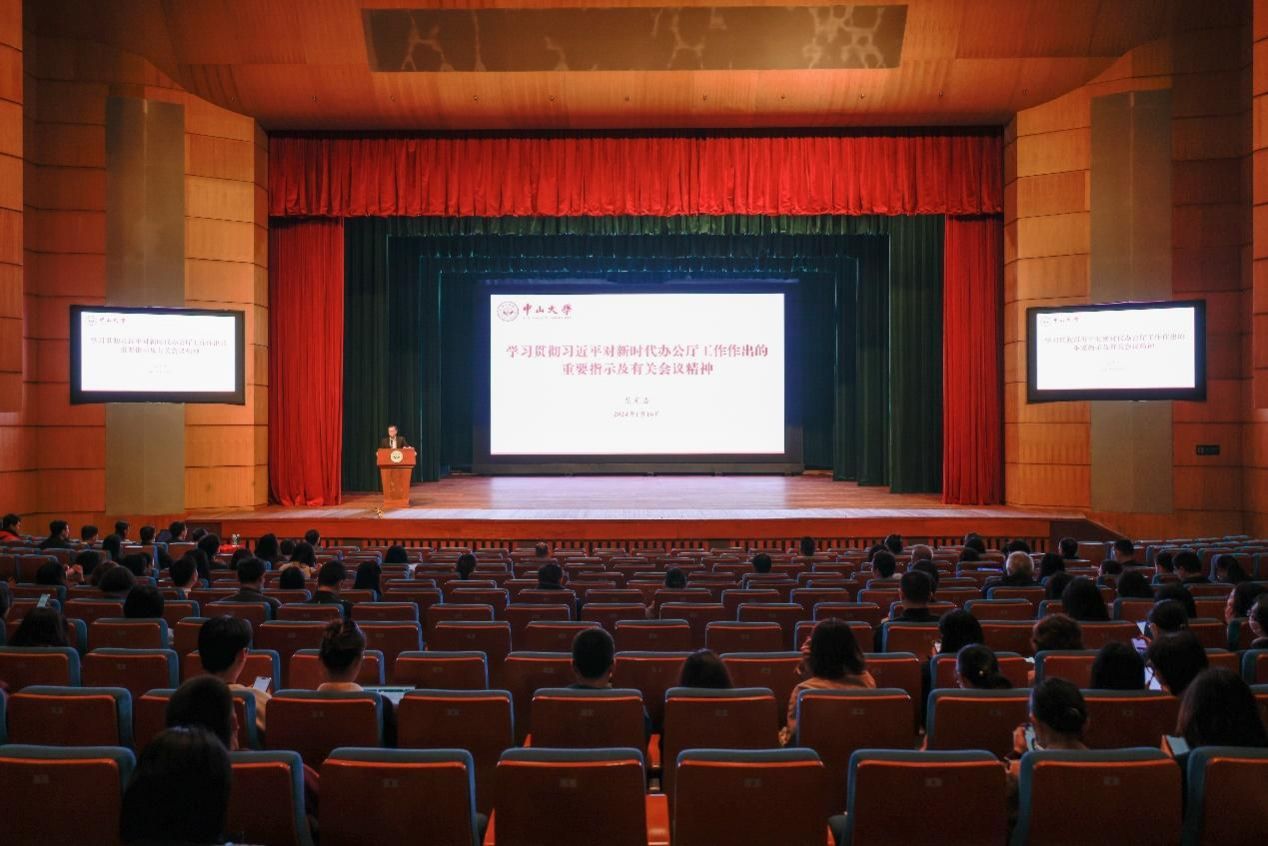 中大新闻网讯(通讯员陈斯敏)1月16日上午,我校组织专题培训,集中学习习近平总书记对新时代办公厅工作作出的重要指示及全国党委和政府秘书长会议精神。培训在梁銶琚堂举行,同时在广州校区东校园、北校区及珠海校区、深圳校区、附属医院设置了10个分会场,全校院系党政办主任、机关综合管理岗人员及其他相关管理人员共900多人参加。培训由校长办公室主任杨建林主持。