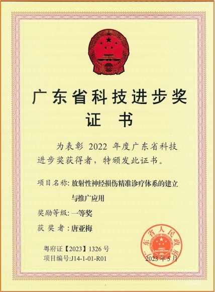 研究成果“放射性神经损伤精准诊疗体系的建立与推广应用”获2022年度广东省科技进步奖一等奖