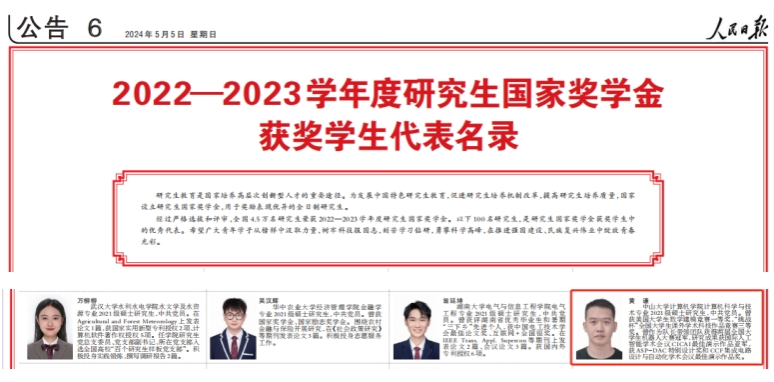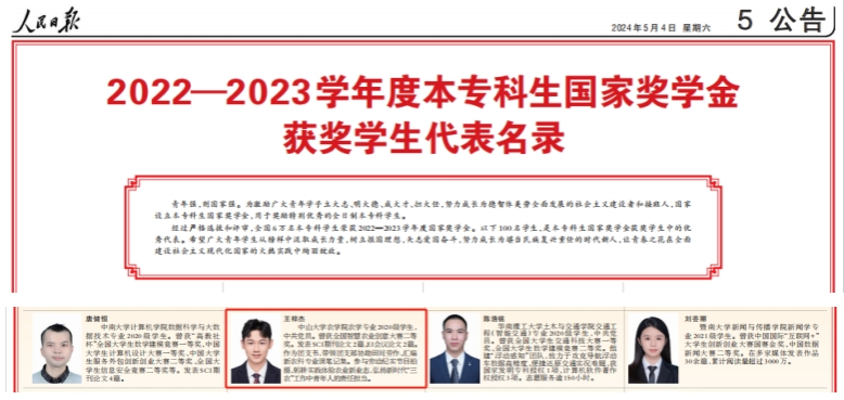 中大新闻网讯(通讯员林仪)5月4日、5日,《人民日报》整版刊登2022—2023学年度《本专科生国家奖学金获奖学生代表名录》《研究生国家奖学金获奖学生代表名录》,我校农学院(现已更名为农业与生物技术学院)农学专业2020级本科生王梓杰和计算机学院计算机科学与技术专业2021级硕士研究生黄谦分别名列其中,这是我校本科生和研究生首次同时入选。