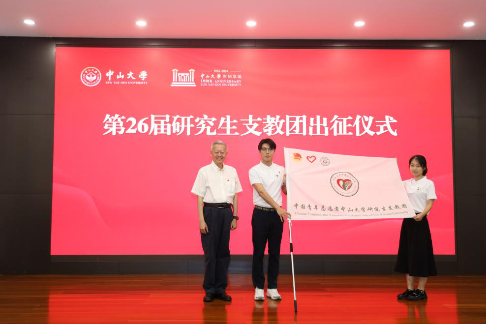 会上还进行了研究生支教团授旗仪式。陈春声书记庄重地将支教团旗帜交到第26届研究生支教团代表手中。