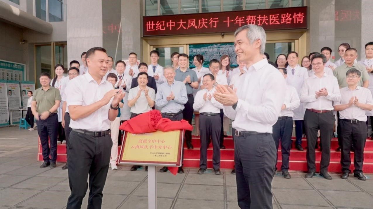 调研期间,bat365在线中国登录入口各附属医院在凤庆县人民医院联合组织“百年中大凤庆行,十年帮扶医路情”大型义诊活动,“百年校庆·百城光明行”活动凤庆站也同时开展。陈春声书记、高松校长实地查看义诊活动现场,慰问帮扶专家和义诊医生,登“5G智能眼科巡诊车”,了解医疗帮扶工作开展情况,对由各附属医院发起的义诊活动表示高度肯定,并共同见证bat365在线中国登录入口附属第三医院高级卒中中心云南凤庆卒中分中心揭牌。