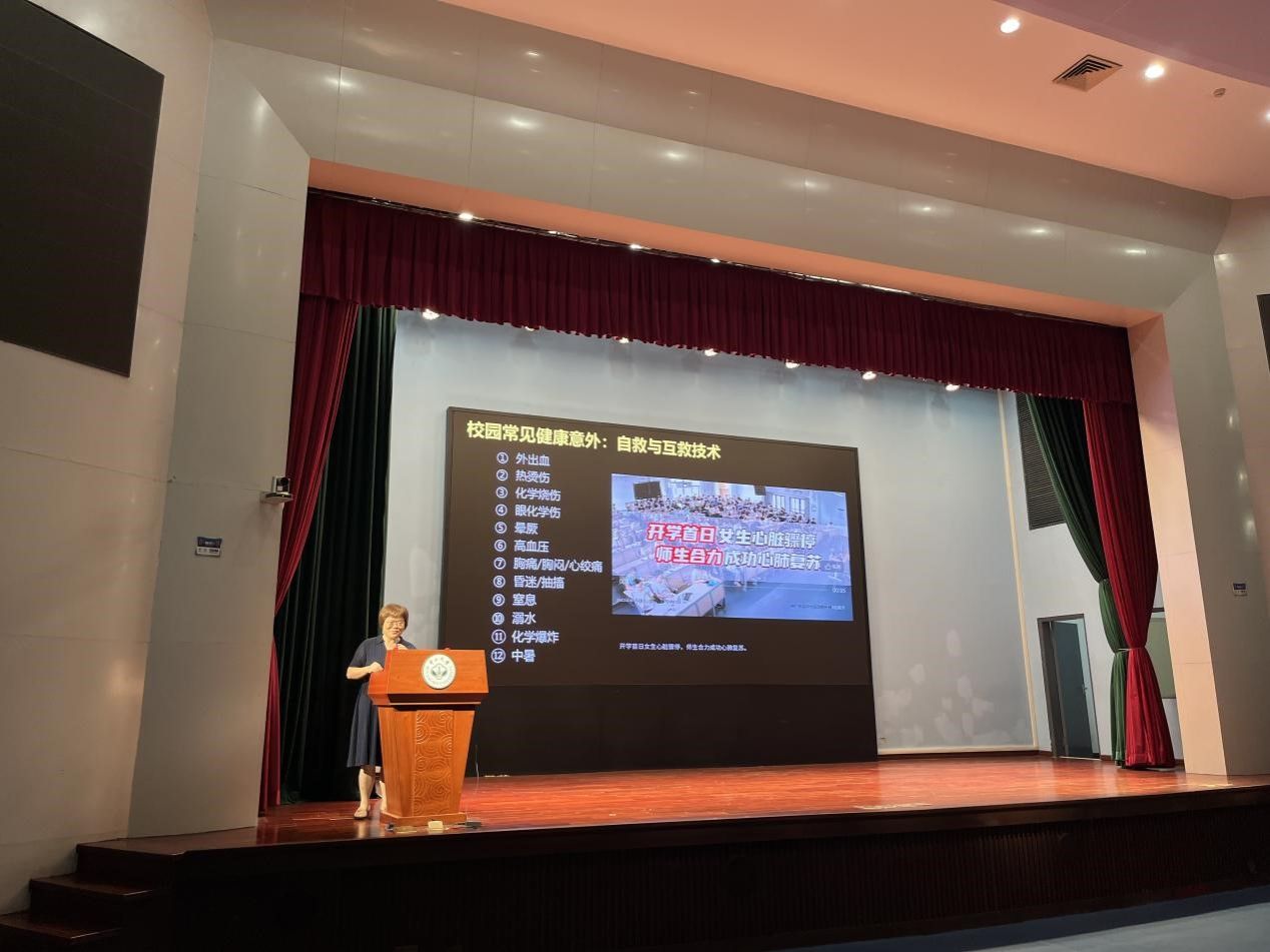附属第一医院急诊科熊艳副主任讲授的是校园常见健康意外的自救与互救技术。从出血、烫伤到到中暑、昏迷,校园生活中的小意外时有发生,熊主任一一讲解了这些常见伤害的产生原因、处理办法与注意事项。这些实用的技能,让同学们在面对突发状况时能够从容应对,保护自己和他人的安全。
