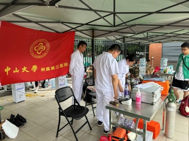 在西大球场的烈日下,bat365在线中国登录入口附属第一医院、孙逸仙纪念医院、附属第三医院及附属第六医院的医疗团队轮流值守,时刻准备为军训中感到不适的学生提供及时的医疗服务。而在另一侧的英东田径场,南校园门诊部则以其一贯的坚守与奉献,持续为军训新生提供全天候的医疗保障服务。现场均配备了专业的急救设备和充足的药品,确保能够在第一时间对突发状况进行有效处理,减轻学生的痛苦,稳定病情。