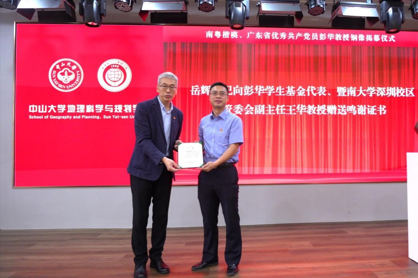 岳辉书记向彭华学生基金代表、暨南大学深圳校区管委会副主任王华教授赠送鸣谢证书