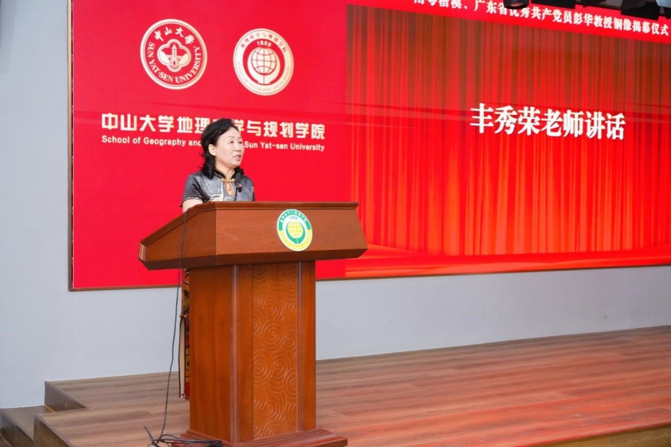 仪式还特别邀请了彭华教授的夫人丰秀荣老师,她表示,在百年校庆之际,彭华铜像的设立和彭华事迹的展览,弘扬了彭华的崇高品格和高尚师德,影响并激励更多中大师生,为地理学科的发展和国家建设贡献更大的力量。她哽咽道:“此刻,我仿佛看见,彭华微笑着又竖起了大拇指,……,为他自己,执着追求,无怨无悔的一生点赞!”在场的每一个人,无不为之动容,眼中闪烁着泪光,心灵深处被这份坚持与热爱深深触动。