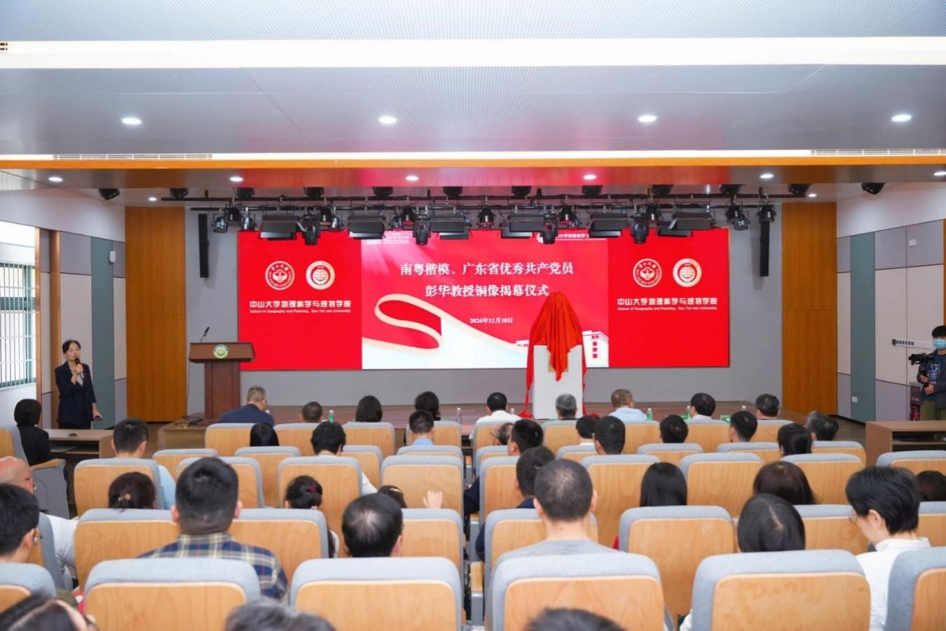 随后,与会领导与嘉宾共同为彭华教授铜像揭幕。据悉,铜像由国家一级美术师、广州雕塑院院长陆增康先生亲自设计并创作,通过“以心塑形,神与物游”的创作理念,将彭华教授的精神世界和学术成就以艺术的形式呈现,传递出积极向上的力量。