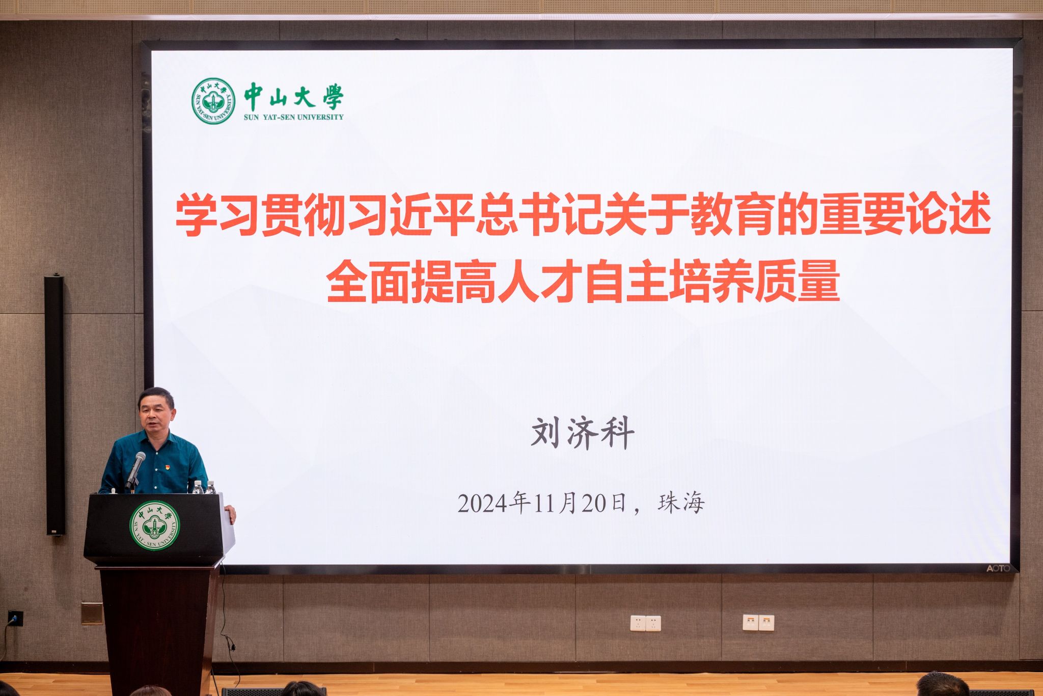 中大新闻网讯(通讯员何甜)11月20日,副校长刘济科教授以“学习贯彻习近平总书记关于教育的重要论述,全面提高人才自主培养质量”为题,结合学校发展和人才培养实际,在珠海校区海琴六号C103为珠海校区旅游学院、哲学系(珠海)、地球科学与工程学院、海洋科学学院等院系200多名学生讲授形势与政策课。课程由旅游学院党委书记黄山主持。