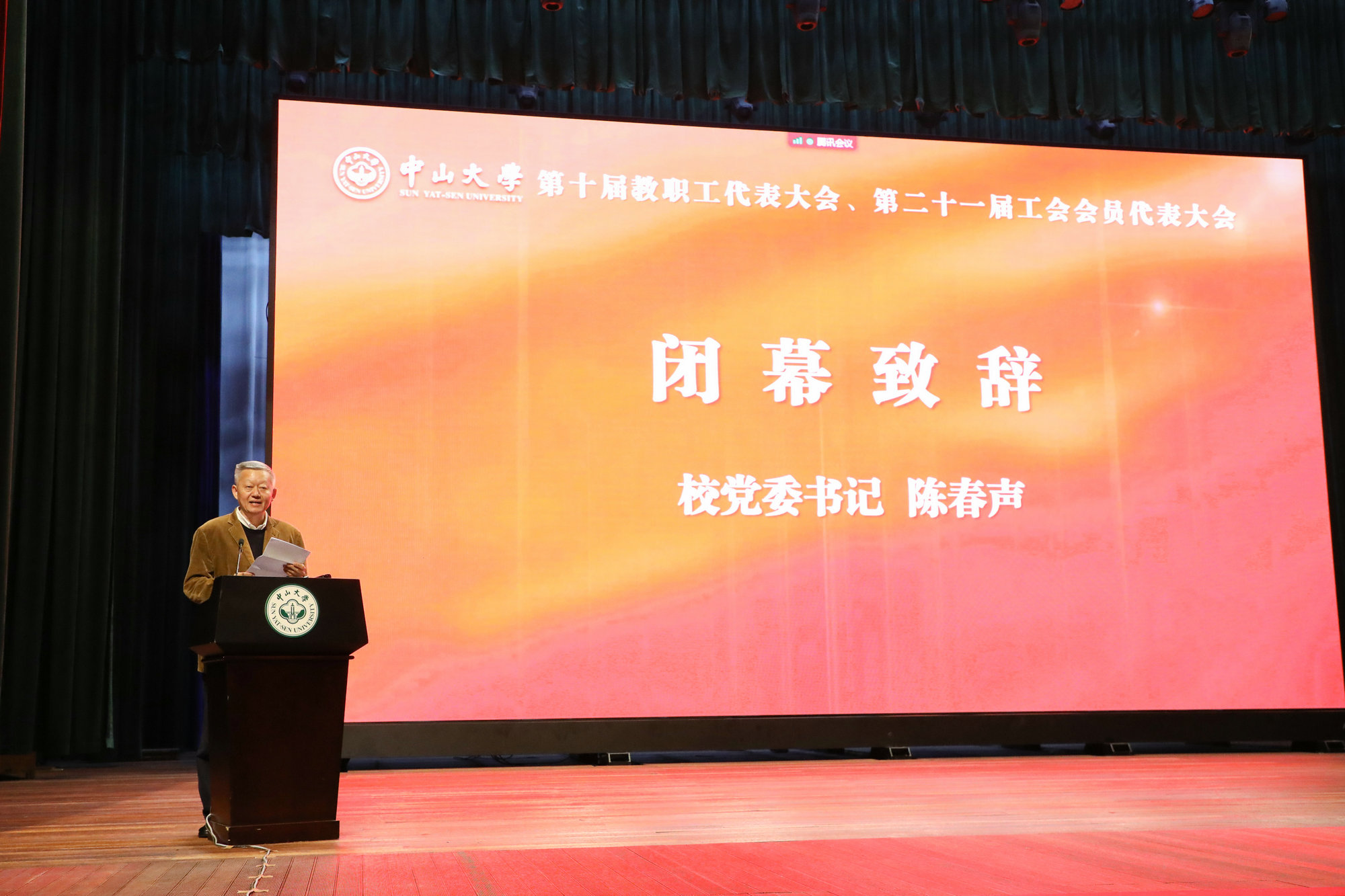 校党委书记陈春声为大会致闭幕辞。他高度评价了本次大会召开的重要意义,充分肯定了上一届工会、教代会取得的成绩,感谢代表们积极参与学校民主管理,为学校各项事业发展提出了有益意见建议,充分体现了胸怀大局、热爱学校、共谋发展的积极态度。他强调,学校党委将继续深入贯彻落实习近平总书记关于党的群团工作系列讲话精神和《中共中央关于加强和改进党的群团工作的意见》,从党的百年奋斗经验中不断汲取力量,加强和改进对工会工作的领导,为工会、教代会履行职责、发挥作用不断创造有利条件。他指出,新一届工会、教代会要进一步坚持和加强党的领导,切实增强工会工作的政治性、先进性和群众性,在加强理论指导实践、推动工作方面实现新突破;要进一步紧密围绕中心、自觉服务大局,在畅通沟通交流渠道、完善学校治理体系与治理能力现代化,引领教职工在为党育人、为国育才、服务国家方面展现新作为;要牢牢坚持以教职工为中心的发展理念,打通服务教职工的新途径,在提升大家获得感、幸福感、安全感方面做出新贡献;要继续与时俱进,推动工会组织改革创新,最大限度凝聚起共同奋斗力量,共创学校的美好明天。