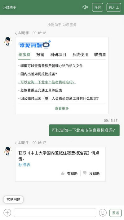 为满足师生不同财经业务场景下的咨询需求,学校梳理整合了财务处所有日常业务场景,力图打造一个信息全面、答复准确、海量更新的机器人知识库。机器人知识库目前所储存的问答内容已经涵盖制度解读、报销指引、国有资产管理、科研经费管理、财务信息系统使用、学费住宿费缴纳等常规业务。同时,机器人采用丰富多样、图文并茂的回答形式,有图片、表格、网页链接、在线文档等多种方式,最大程度地提高界面友好度和使用满意度。如果遇到机器人回答不了的个性化问题,师生还可留言咨询,财务处安排有后台专员做出快速响应。