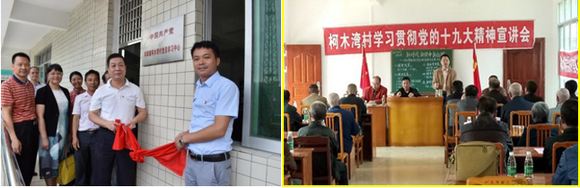 左图:古添雄(左一)参加泽芳楼挂牌仪式 右图:古添雄向村民宣讲十九大精神(来源:校工会)