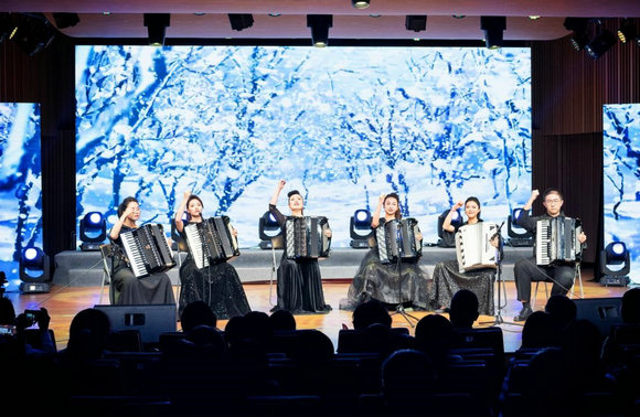 手风琴合奏一曲《打虎上山》,气势磅礴,旋律激昂,展现跨雪原、翻山岭的艰苦卓绝和不屈不挠的决心与斗志。