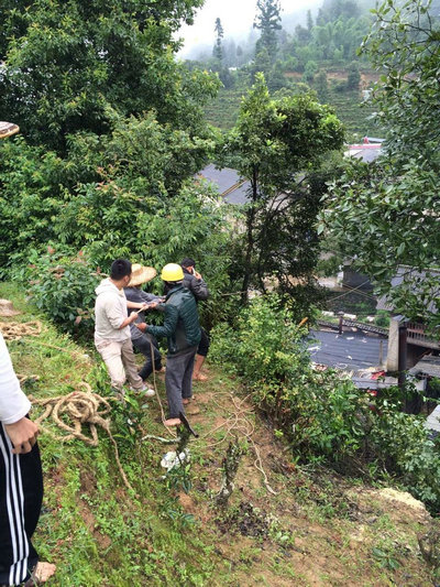 麦伟立(左一)与村民们一起抢险救灾(来源:校工会)