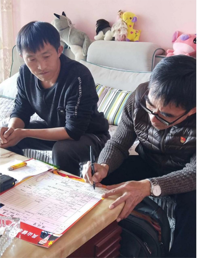 郭兴勇(右)在红塘村张廷华家核实红卡信息(来源:校工会)