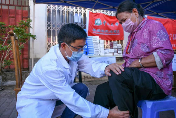 李玉希医生为病人检查膝盖(来源:党委宣传部)