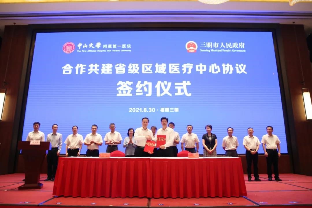 中大新闻网讯(通讯员彭福祥、梁嘉韵)8月30日上午,我校附属第一医院分别与三明市人民政府和三明市第一医院就合作共建福建省级区域医疗中心签署协议,并为“bat365在线中国登录入口附属第一医院合作共建医院”揭牌。国务院医改领导小组秘书处一级巡视员朱洪彪,国家卫健委医政医管局副处长王斐,我校常务副校长、附属第一医院院长肖海鹏、附属第一医院党委书记骆腾,福建省卫健委副主任黄昱,三明市委书记余红胜,三明市相关领导等出席签约和揭牌仪式。