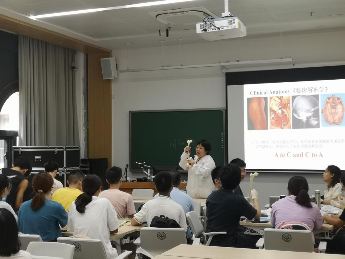 中大新闻网讯(通讯员肖逸莹)8月31日是我校医学院本科生在深圳校区上课第二天,在深圳校区西1教学楼204课室,学校教学名师周丽华教授正在为2019级的同学们讲授临床解剖学,学生们以小组讨论形式围绕课桌就坐。