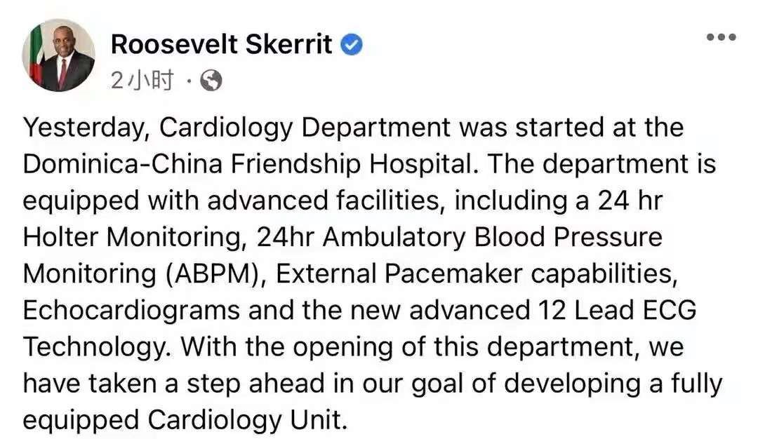 多米尼克总理斯凯里特在其个人脸书发布当地首个心血管内科设立的消息(来源:附属第一医院)