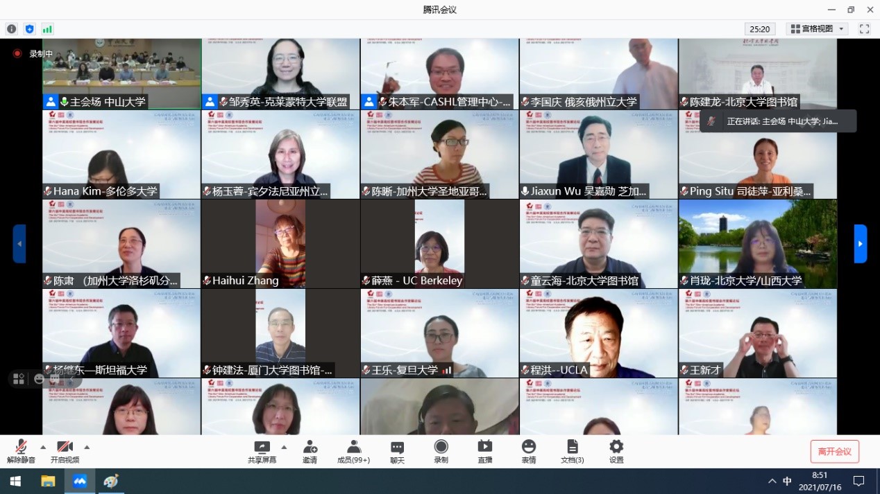 中大新闻网讯(通讯员薛玉、苏日娜)7月16-17日,第六届中美高校图书馆合作发展论坛在我校召开。本次论坛由中国高校人文社会科学文献中心与我校图书馆联合主办。我校校长助理王帆,中国高校人文社会科学文献中心管理中心主任、北京大学图书馆馆长陈建龙,北美中国研究图书馆员学会轮值主席、芝加哥大学东亚图书馆中国研究馆员吴嘉勋以及来自北美、欧洲、中国大陆和港澳台地区约330位专家学者参加了会议。本次论坛主题为“后疫情时代高校图书馆文献与服务新方向”,以线上会议的形式举行。