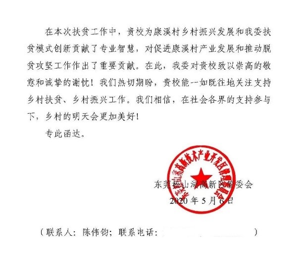 通过研究院贡献的专业知识受惠的不止云吟村。2020年6月,东莞松山湖高新技术产业开发区管理委员会发来感谢信,对研究院为其对口帮扶的韶关市康溪村提供的扶贫模式指导表示衷心的感谢。