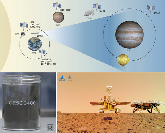 上:中国深空探测规划图;左下:嫦娥五号返回的月球样品;右下:祝融号在火星表面获取的影像