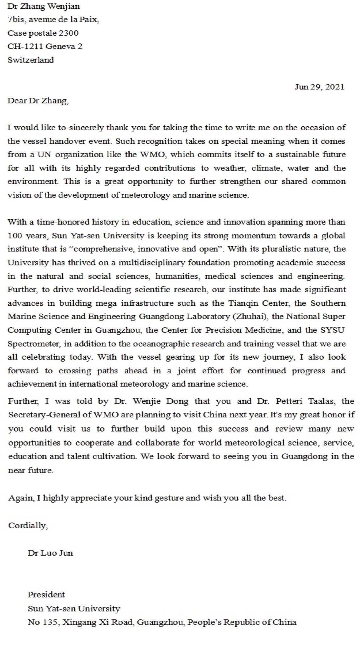 世界气象组织张文健助理秘书长给罗俊校长发来贺电(来源:世界气象组织)