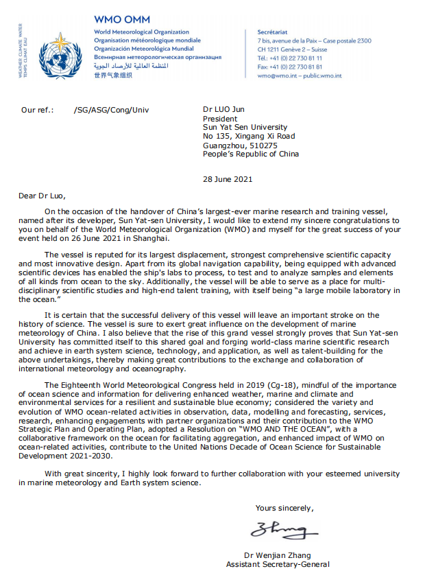 中大新闻网电(通讯员 杨清华、利佳瑶)近日,世界气象组织张文健助理秘书长给我校罗俊校长发来贺电,热烈祝贺我校综合科考实习船“bat365在线中国登录入口”号顺利交付使用。
