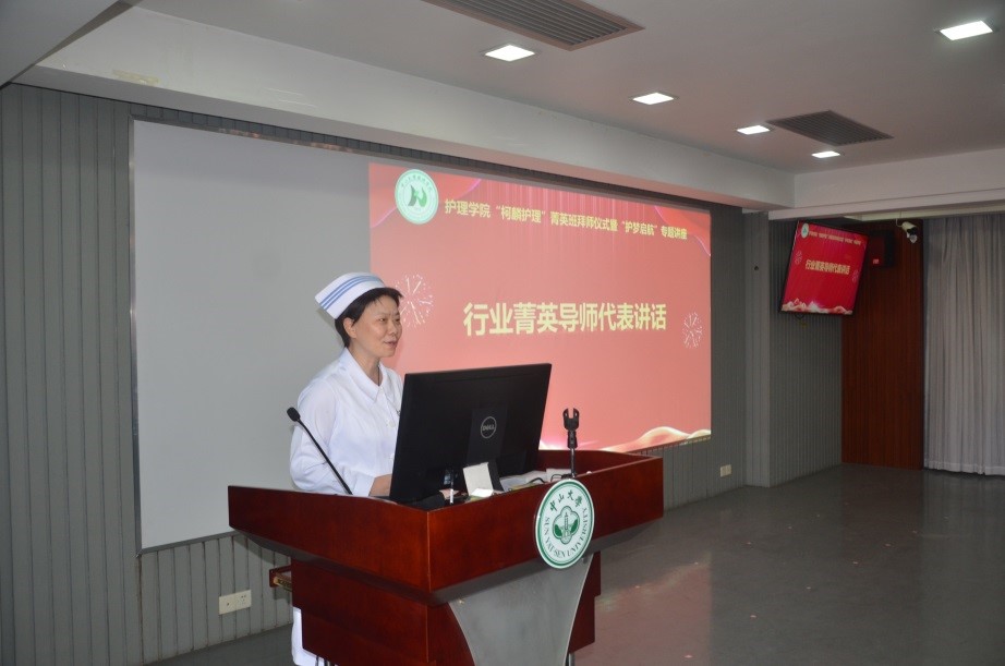 学院硕士生导师、行业菁英导师成守珍在2021年“柯麟护理”菁英班拜师仪式上讲话(来源:护理学院)