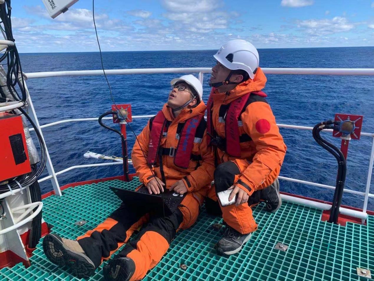 张功博士(左)与科考队员在南极宇航员海调试科学桅涡动通量观测系统(来源:大气科学学院)