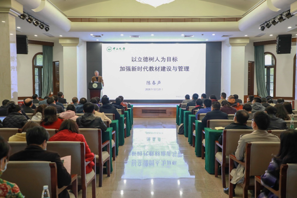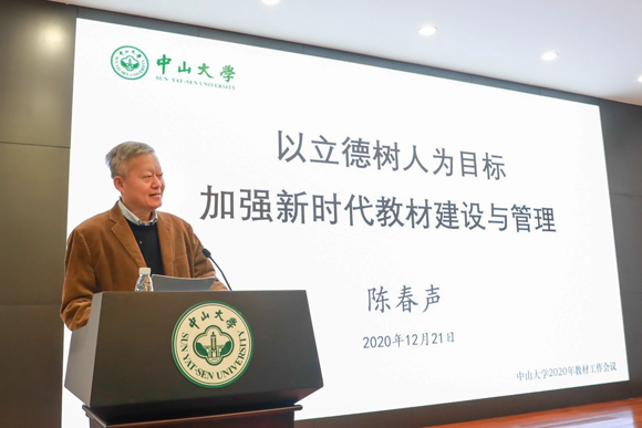 会上,陈春声书记作了题为《以立德树人为目标,加强新时代教材建设与管理》的主题报告。他首先传达了习近平总书记对教材建设的重要指示精神和首届全国教材工作会 议精神,强调要从加强党的领导、坚持正确方向、加强政治把关、健全教材体系、注重改革创新五个方面深入学习领会,把握新时代教材工作新要求。陈春声书记结合学校教材工作的现状与面临的新形势、新任务、新要求,提出要对标一流本科教育的标准、立德树人的根本任务和学校提出的十二字人才培养目标,坚持正确方向,加强统筹指导,提高管理水平,强化责任担当,创新工作思路,凝聚工作合力,深入推进习近平新时代中国特色社会主义思想进课程、进教材,全面提升教材工作水平。