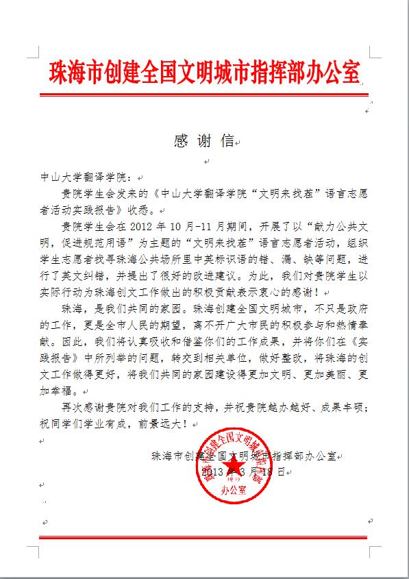 近日,珠海市创建全国文明城市指挥部办公室向我校翻译学院发来感谢信,对翻译学院学生会开展的“文明来找茬”语言志愿服务活动给予高度评价,对学生撰写提交《珠海市公共场所中英文标识翻译规范报告》、为珠海创建全国文明城市建言献策的助力行动,表达了诚挚的感谢。